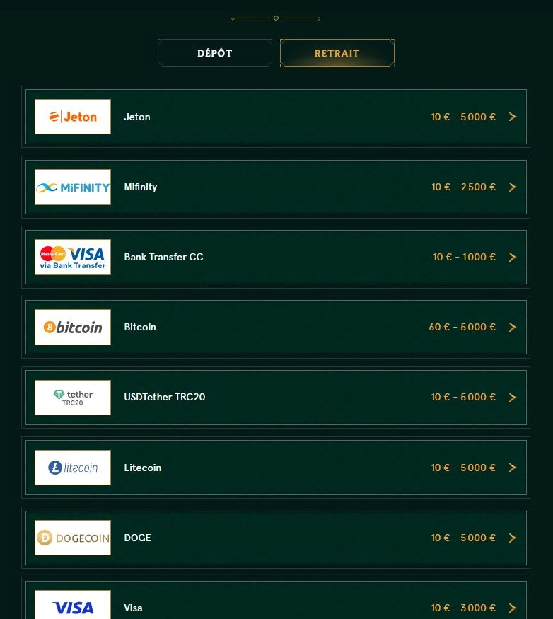 - Cartes de crédit/débit : Les joueurs peuvent utiliser des cartes de crédit et de débit majeures telles que Visa et MasterCard pour des dépôts instantanés, garantissant ainsi la commodité et l'accessibilité.